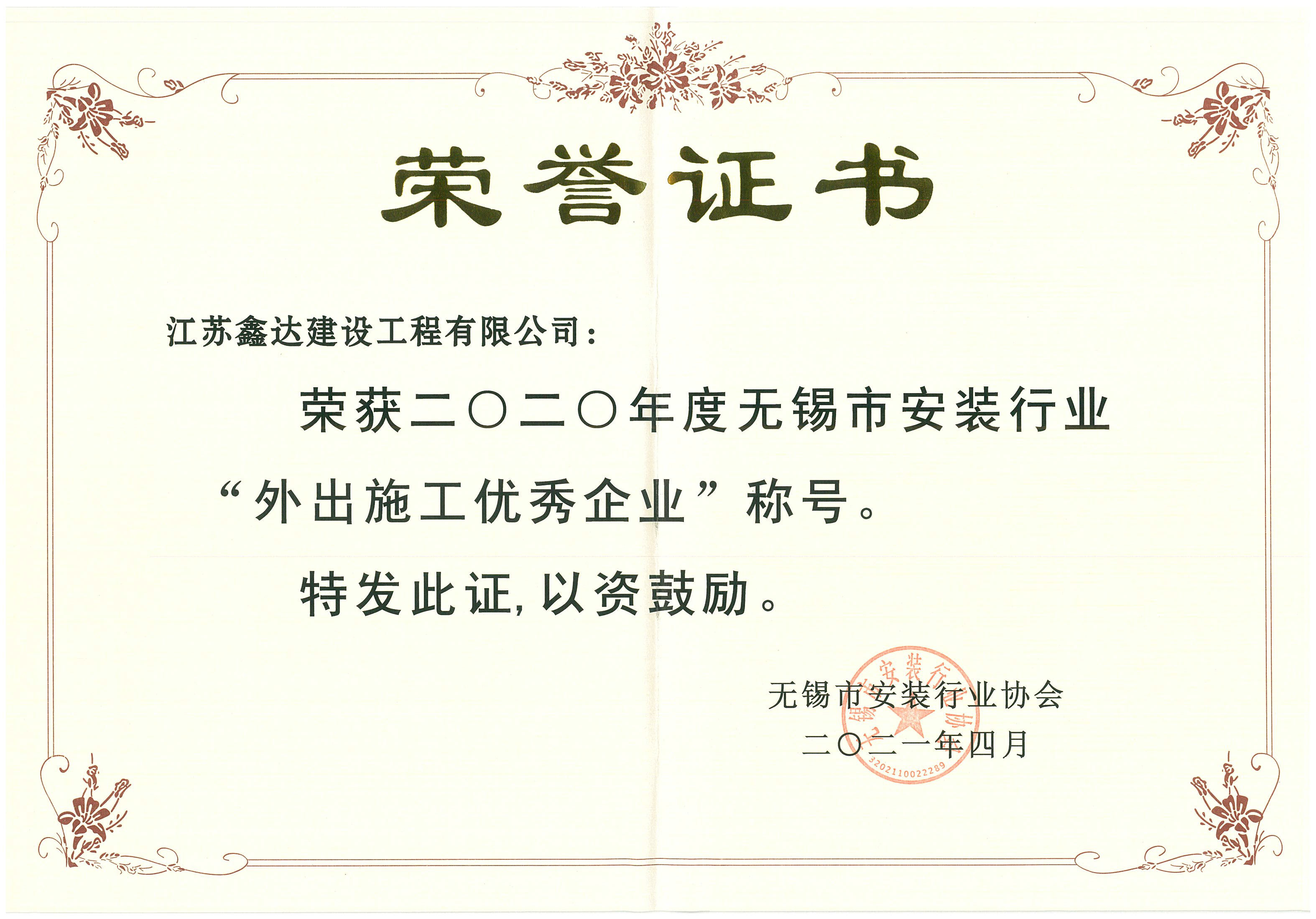 会上,我司被授予2020年度无锡市安装行业“优秀企业”和“外出施工优秀企业”两项荣誉,运营副总经理周运成代表公司参会并领奖。